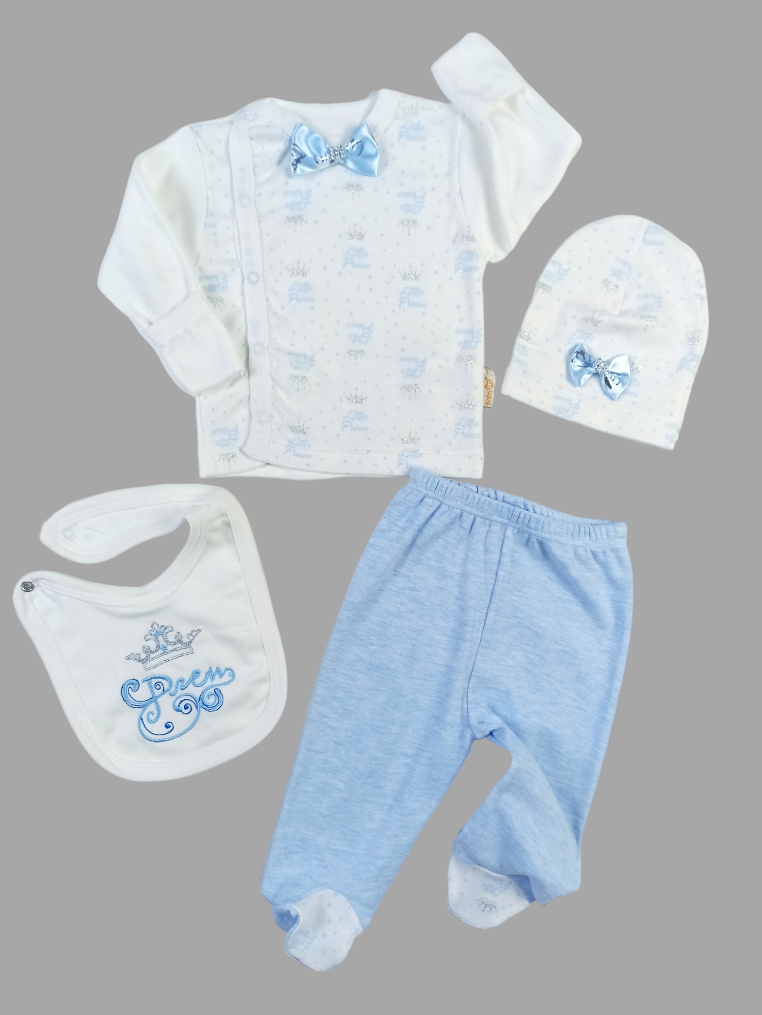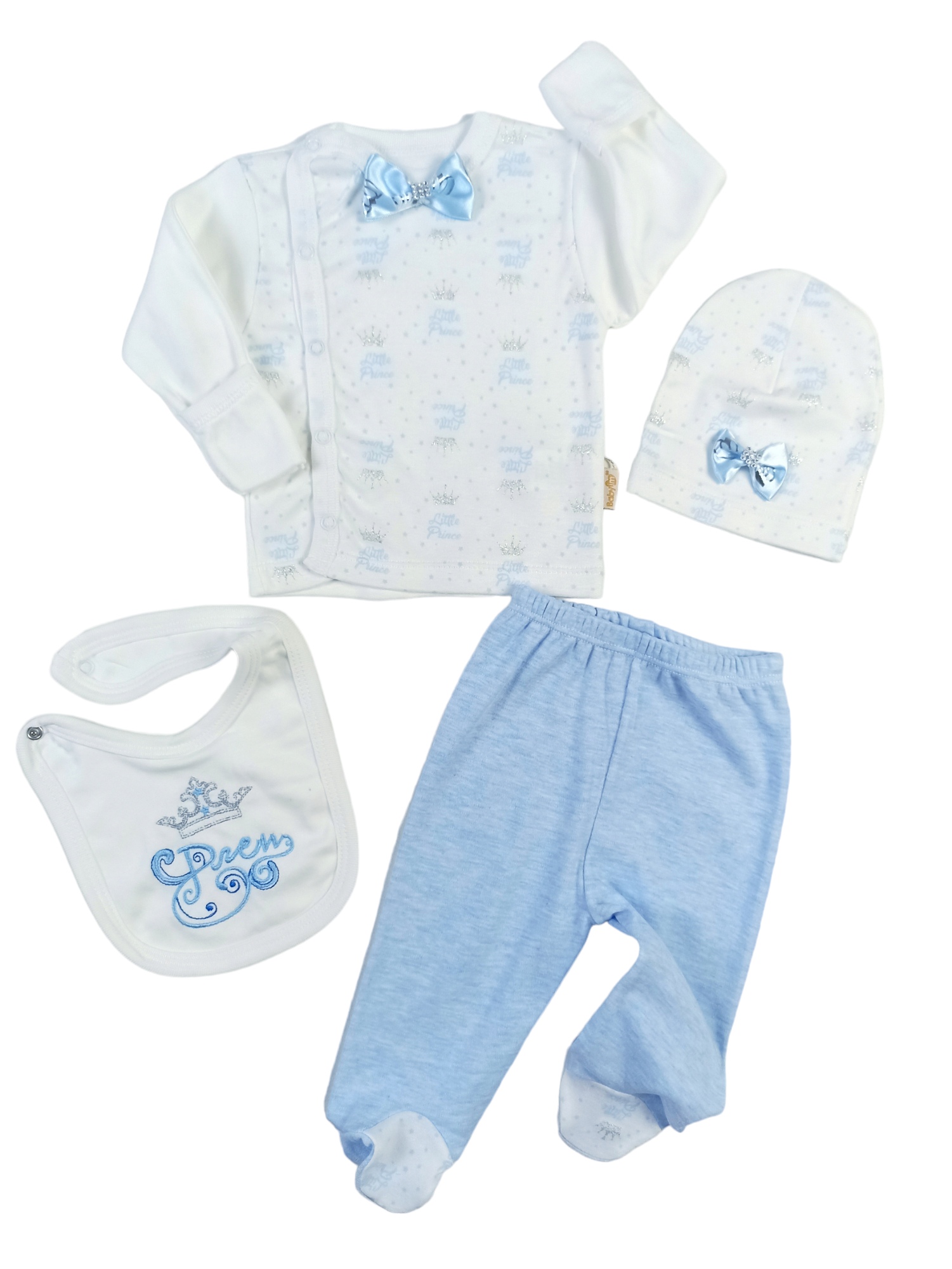BABYİM PRİNCE TAKIM - 2380 - - PATİKLİ ZIBIN ALTI ZIBIN ÜSTÜ (ELDİVENLİ) ÖNLÜK PENYE BEREDEN OLUŞAN 4 PARÇA TAKIM %100 PAMUK BEDEN: 0-3 AYTEK BEDENDİR. 3.5 KG.-6 KG